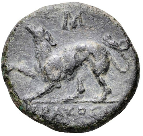 Hound standing left, forepaw raised; monogram above; in ex ΣYPAKOΣIΩN