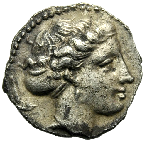 Kopf der Arethusa n.r., Haar in Sphendone, geschmückt mit Ohrring und Halskette, links Delphin