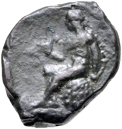 Apollo sitzt auf Omphalos n.l mit erhobenem rechten Arm