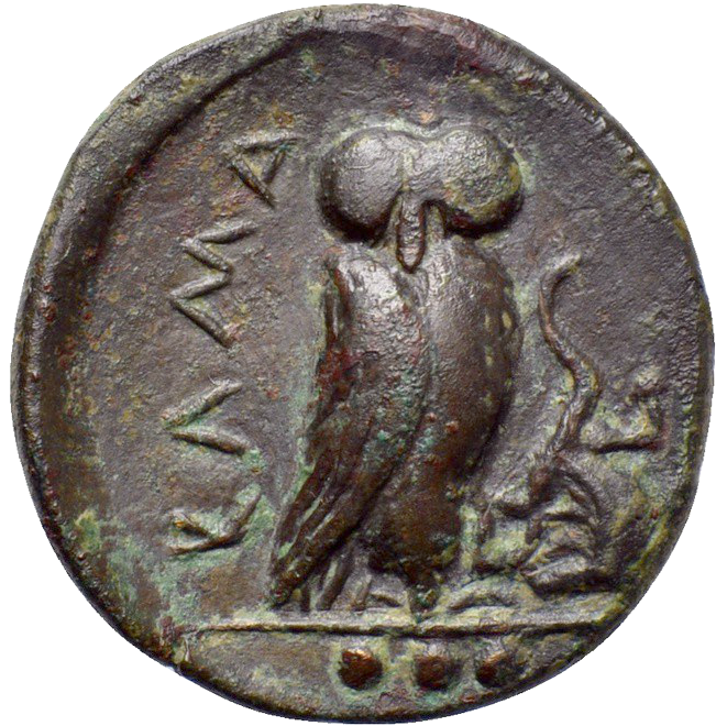 Large owl with upright body, in field l KAMA; right lizard: in exergue three pellets