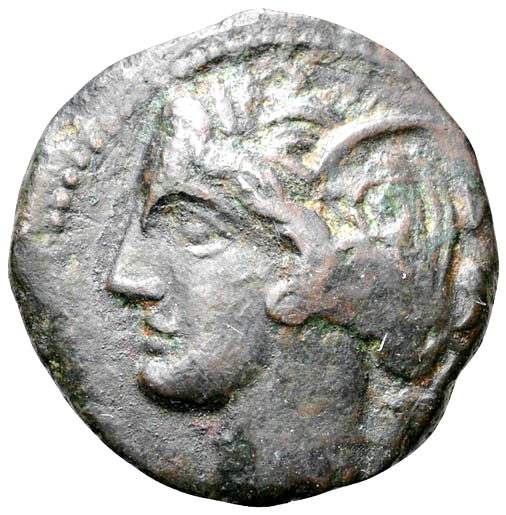 Wreathed head of Tanit left, dotted border