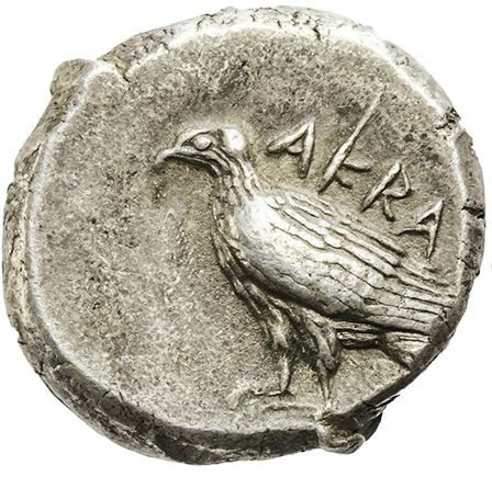 Adler mit geschlossenen Flügeln steht nach links; darüber AKRA