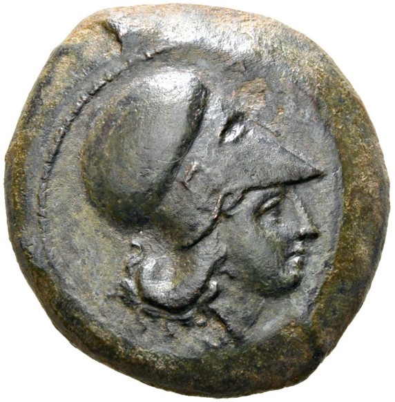Head of Athena r., wearing Corinthian helmet, in front AITNAIΩN