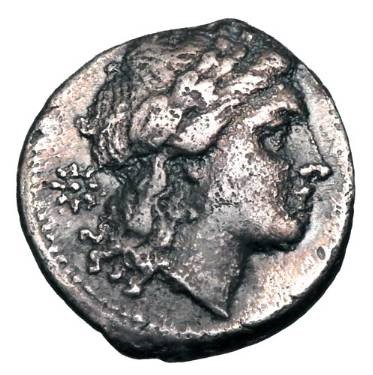 Kopf des Apollo mit Lorbeerkranz n.r., dahinter im Feld l. 8-strahliger Stern