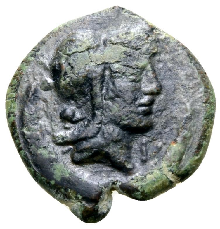 Helmed head right; below pellet.; below large crescent, dotted border, V below chin