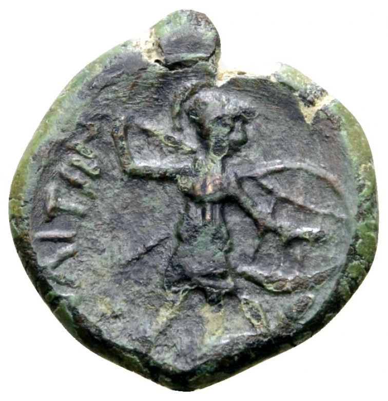 two obverse types are extant for this reverse from Gaulos: one such as the present piece is helmeted and is likely to be Athena or Roma and one with a head that appears unadorned or possibly wearing a diadem, said to be Astarte