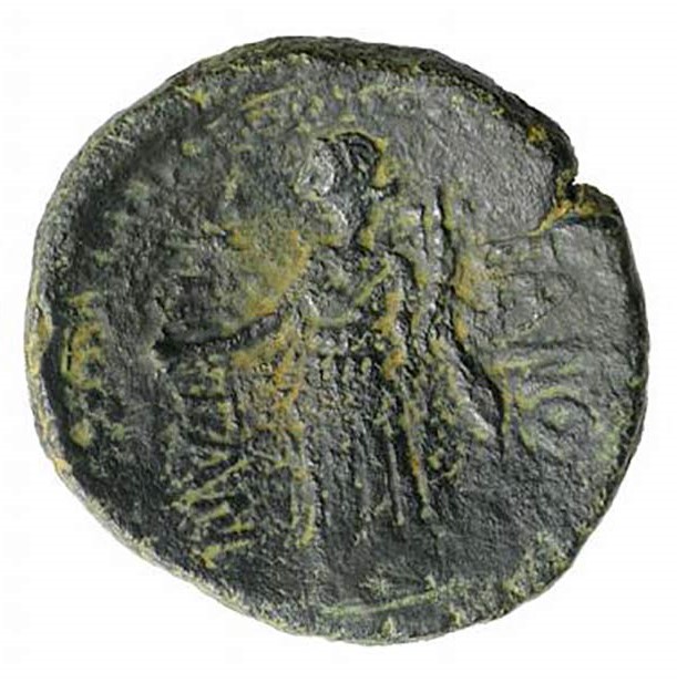 ΠANOP-MITAN, weibl. Figur steht n.l.; hält patera inder rechten und Füllhorn i.d.linken Hand, Perlkreis.