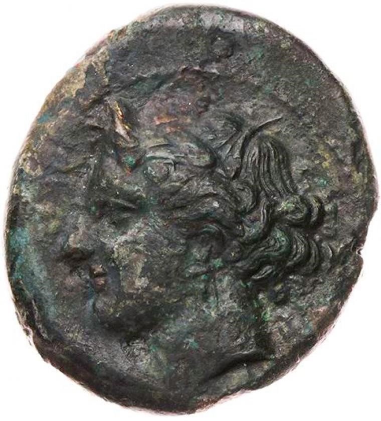 Head of Kore wreathed with corn to l.