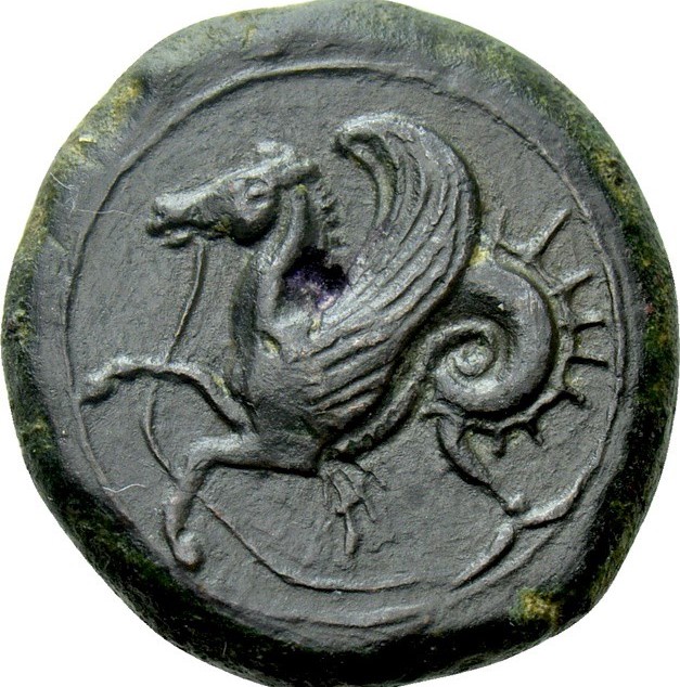 Head of Athena to left, wearing a wreathed helmet; two dolphins, one in front and one behind the head; in field left ΣYPA