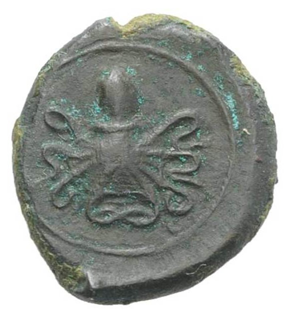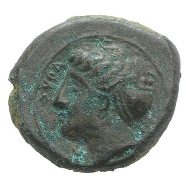 Nympfenkopf n.l.; vor der Stirn ΣYPA, hinter dem Kopf E