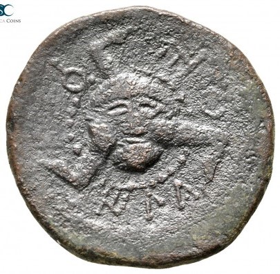 Big triskeles, oround head dotted border, around legend