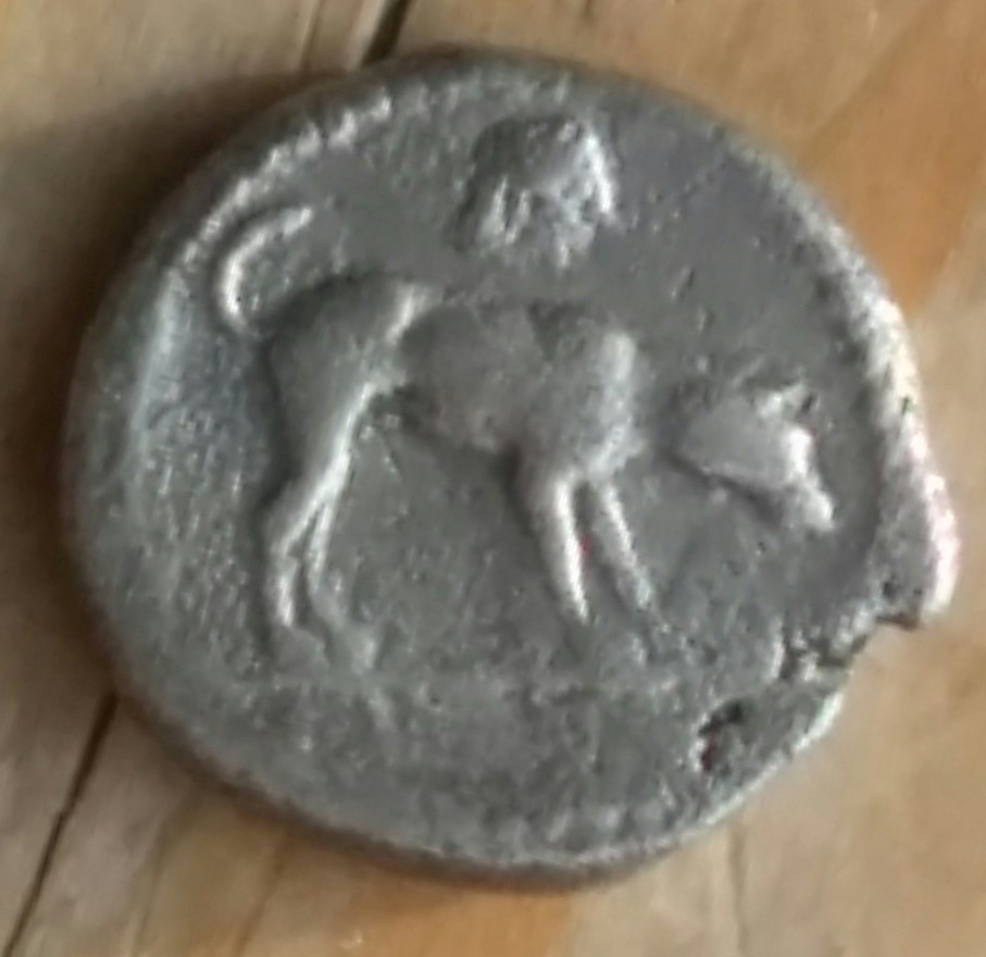 Hund mit leicht gesenktem Kopf n.r.stehend; oben Nymphenkopf n.r.; Perlkreis