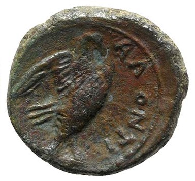 Adler mit gespreitzten Flügel n.r., eine Beute in den Krallen; rundum AΛoNTI[NΩN]
