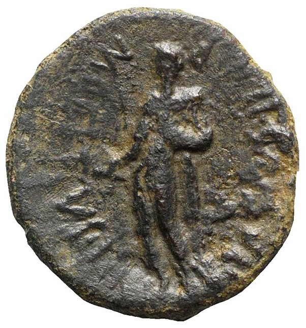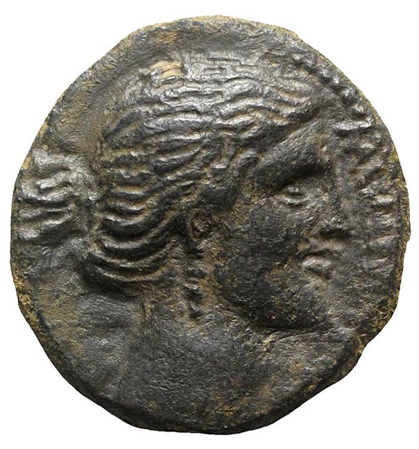 Weibl. Kopf (Artemis?) n.r., geschmückt mit Ohrringen; das Haar über dem Nacken zusammengebundenn MUN HENNAE