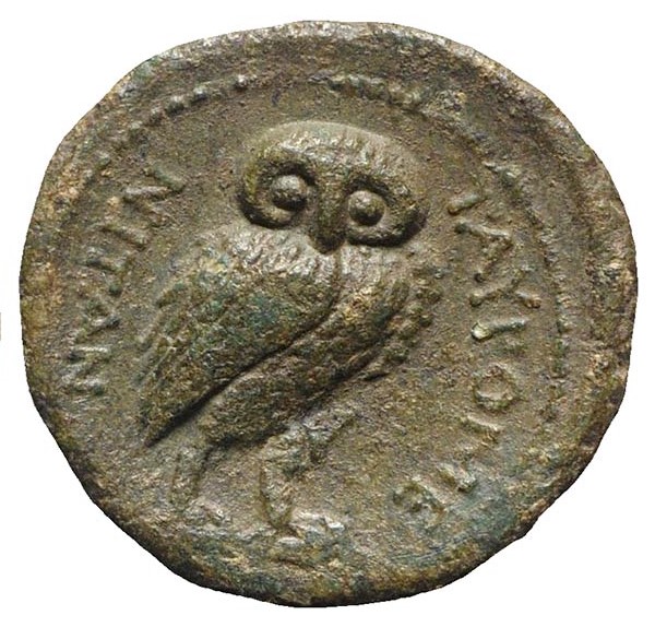 Owl standing facing; araund TAYPOME-NITAN, dotted border