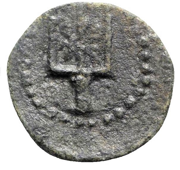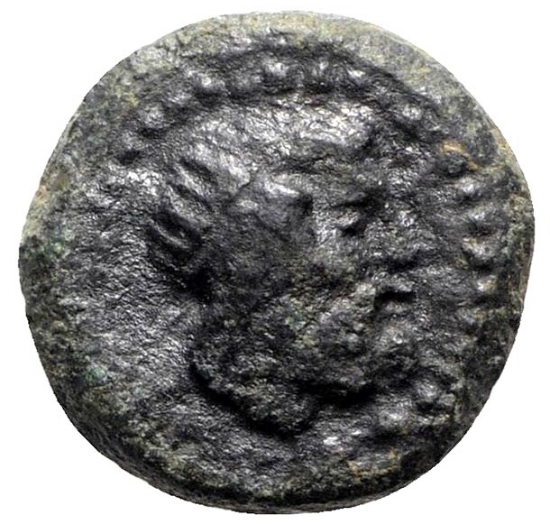 Bärtiger Kopf des Poseidon mit Lorbeerkranz n.l ; Perlkreis