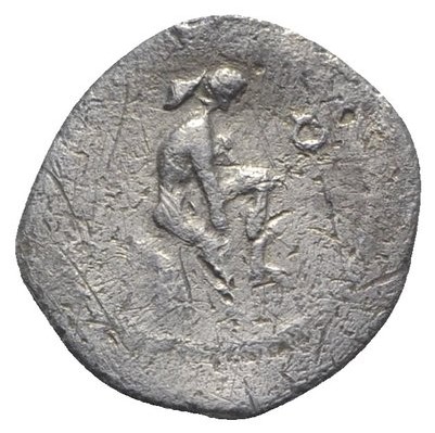 Hermes seated r. on rock, fastening sandal; kerykeion in field r.