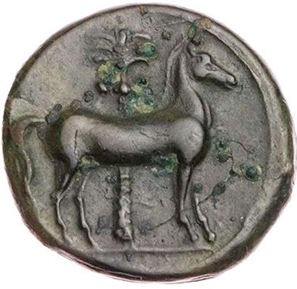 Pferd steht vor Dattelpalme n. r., davor rechts drei Punkte, Fadenkreis