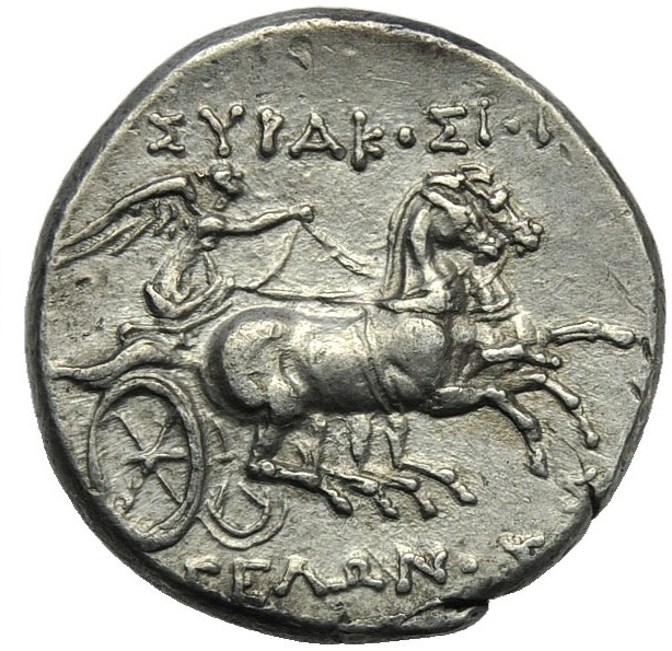 ΣΥΡΑΚoΣΙoI, Nike driving fast biga r.; between legs, Σ., below ΓΕΛΩΝoΣ