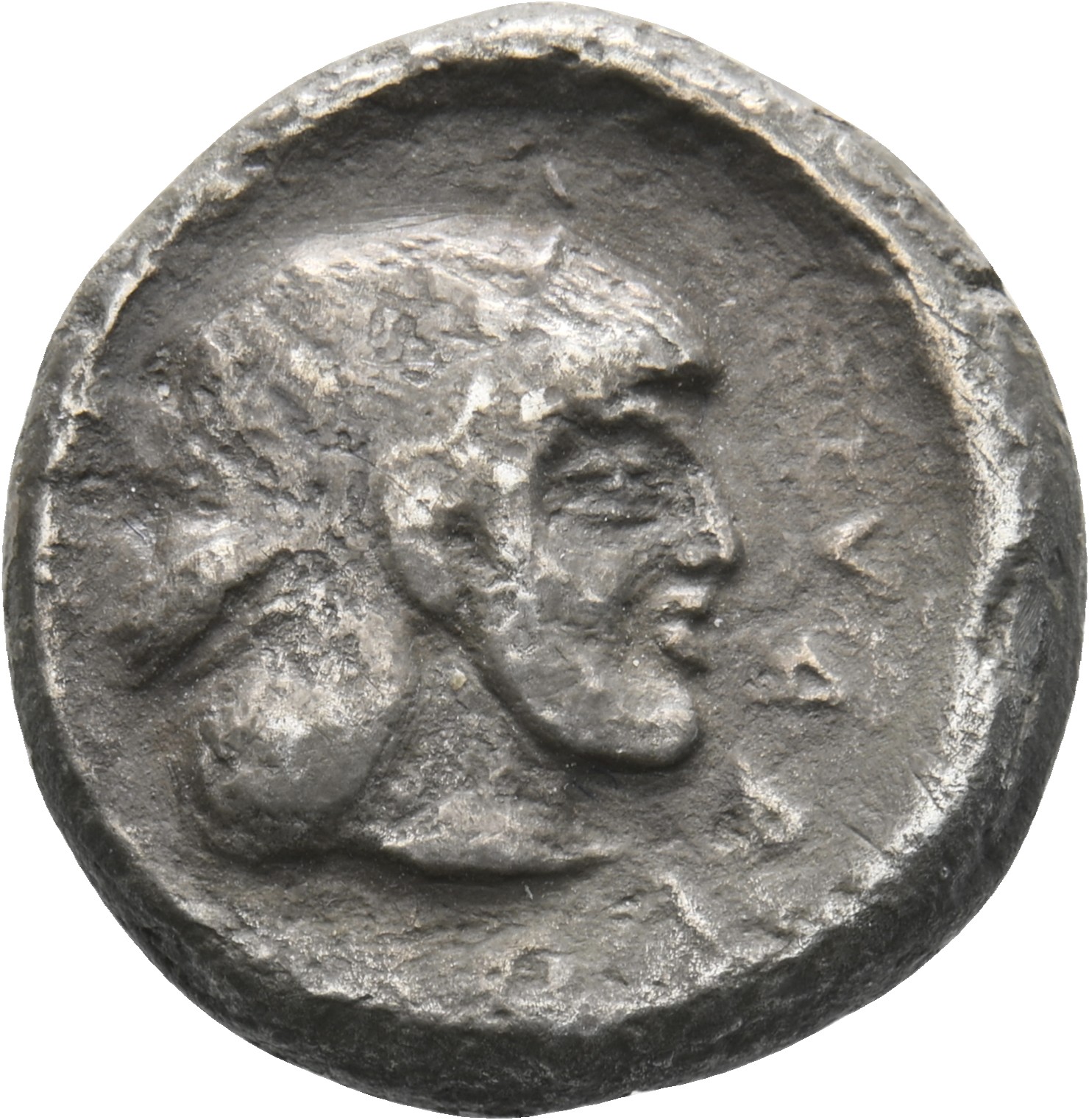 Head of Arethusa to right, hair hold with a dotted hair-band , she has also dotted necklage; around ΣVRAK[OΣION]