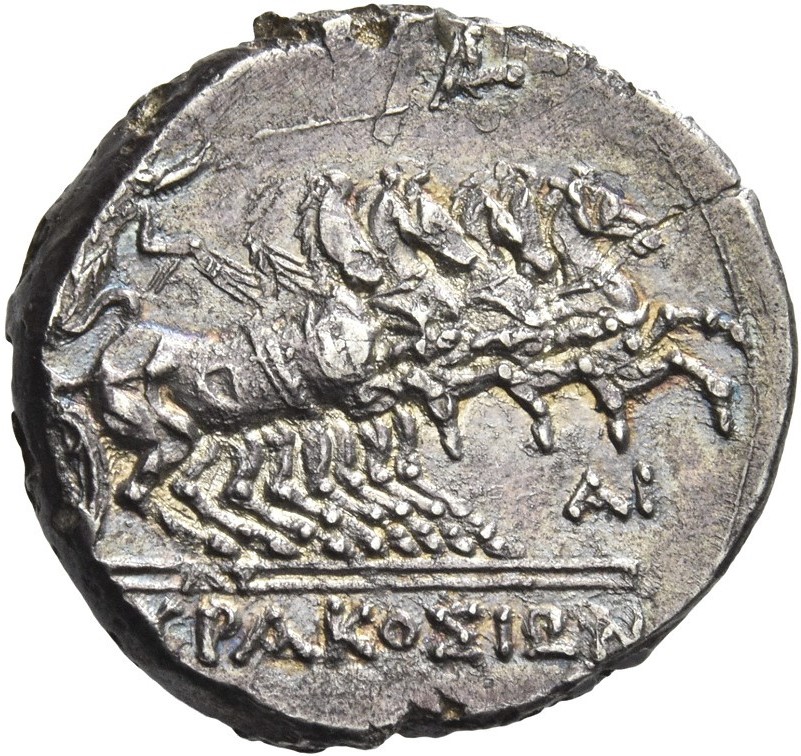Rv.: Nike im Chiton lenkt galoppierende Quadriga n.r., hält in der Rechten Kentron und die Zügel in der Linken; oben im Feld Monogramm APK, rechts AI; in der doppelten Abschnittslinie ΛY ; unten im Abschnitt [Σ]YPAKOΣIΩN