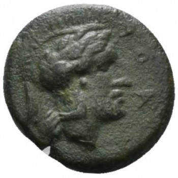 Female figure wearing a long chiton, seated on throne, right.She holds in raised right hand a trident and in lowered left a bow