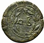 QB im Lorbeerkreis, herum Fadenkreis (QB steht für Quintius Baebius)