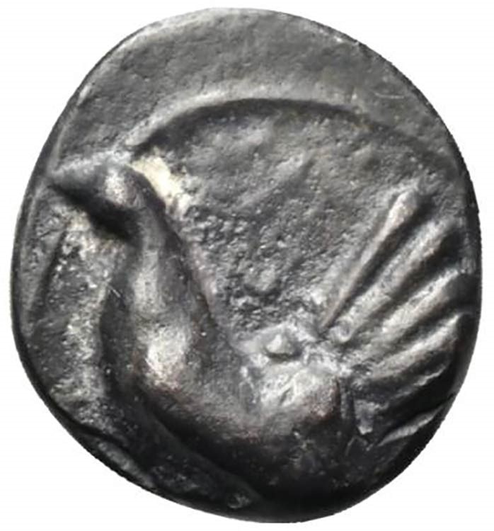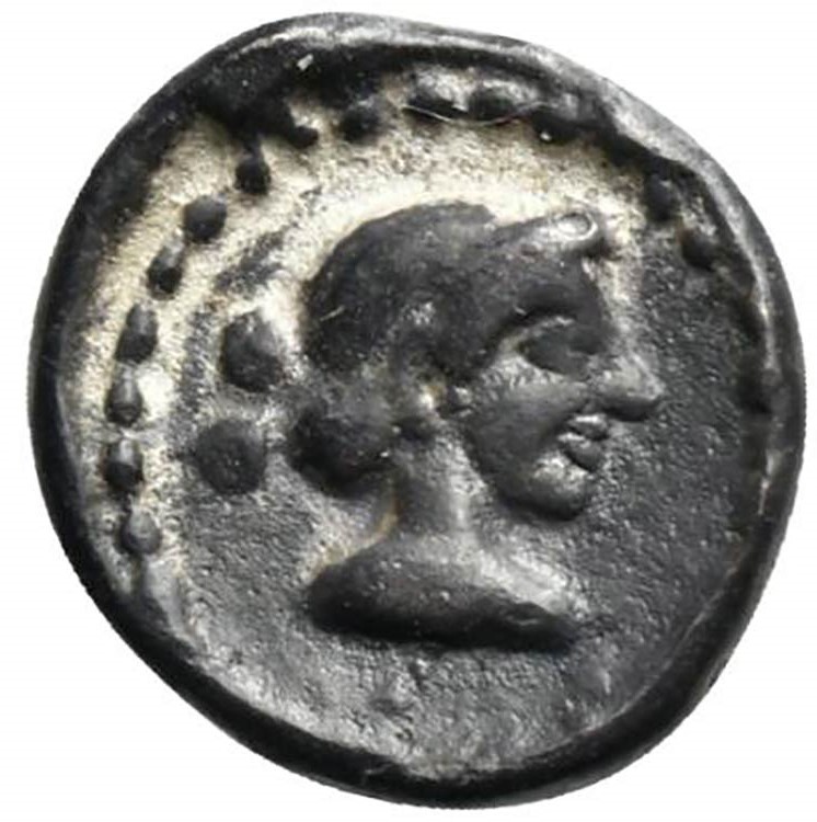Weiblicher Kopf mit Krobylos-Frisur nach rechts, Perlkreis