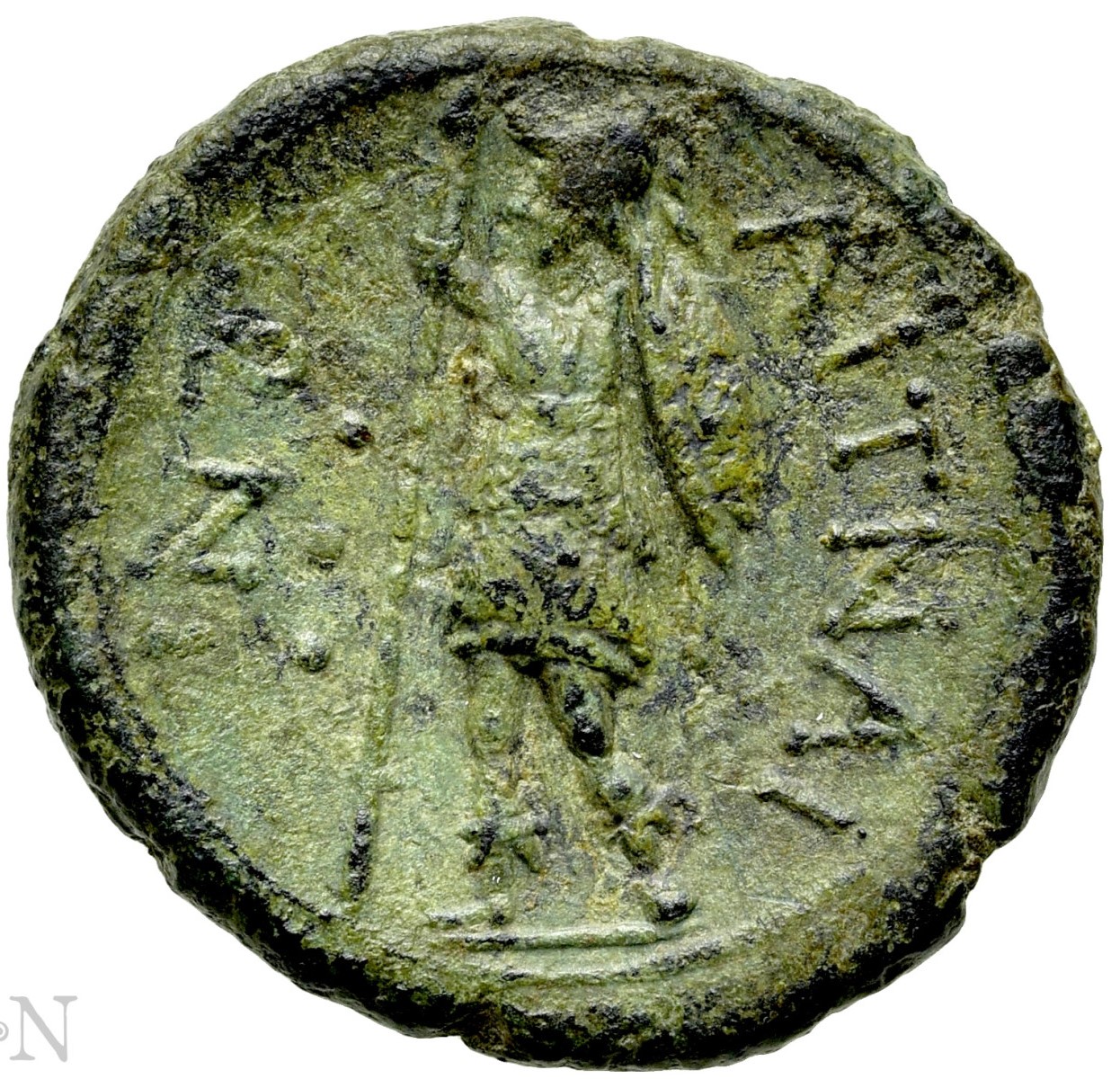 Warrior standing left, head left, holding spear and shield; three pellets (mark of value) to left. ; around AITNAI-ΩN
