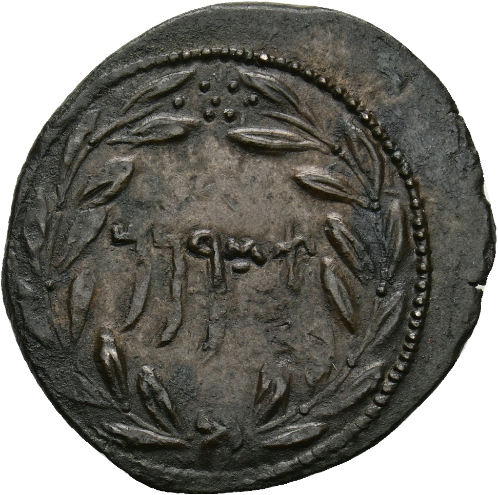 Laurel wreath with berries and a rosette on top, tied ribbon at bottom, inside punic YRNM
