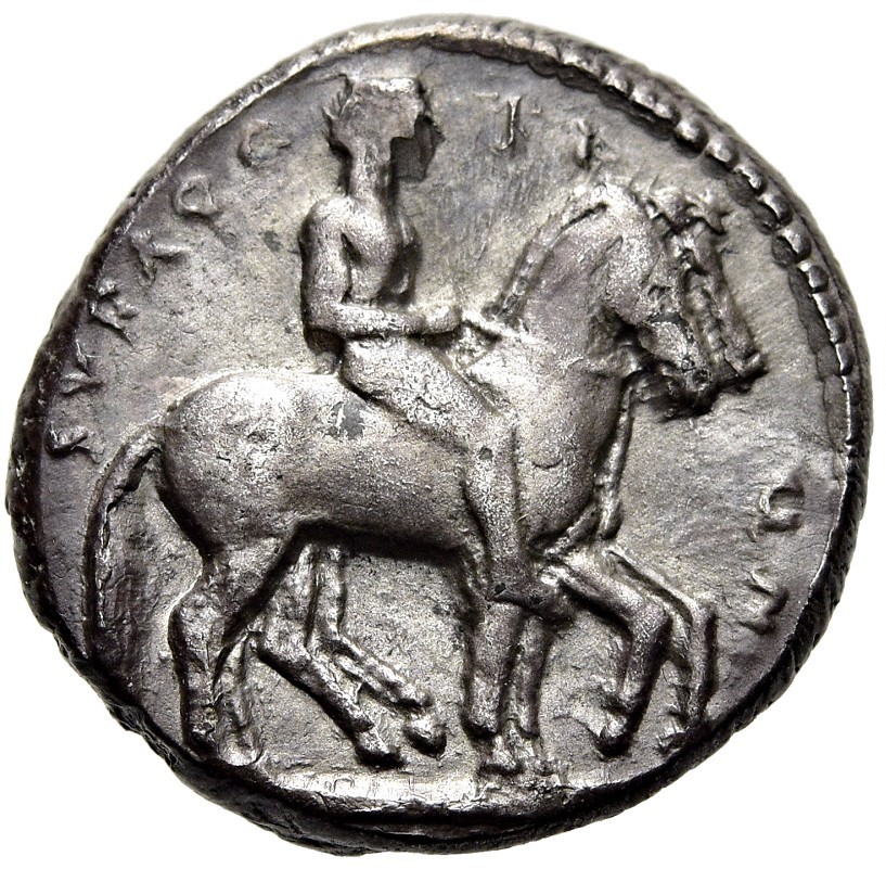Av.: Nackter, jugendlicher Reiter im Schritt nach r. Er hat den Zügel seines Pferdes locker in der Rechten, neben ihm ein zweites Pferd. Außen Perlkreis. Im Rund ЅVRAQ-SI-ON.[Dreifache Abschnittslinie, die mittlere geperlt]