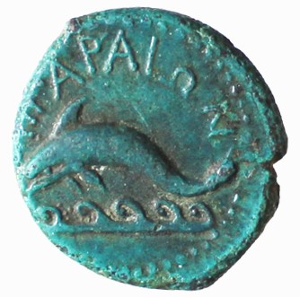 Delphin nach links,darüber [ΛΙ]ΠΑΡΑΙΩΝ,Ex-Linie mit stilisierten Wellen nach links gedreht. Perlkreis