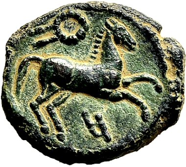 Horse galloping right; wreath above the horse; below Punic letter; dotted border