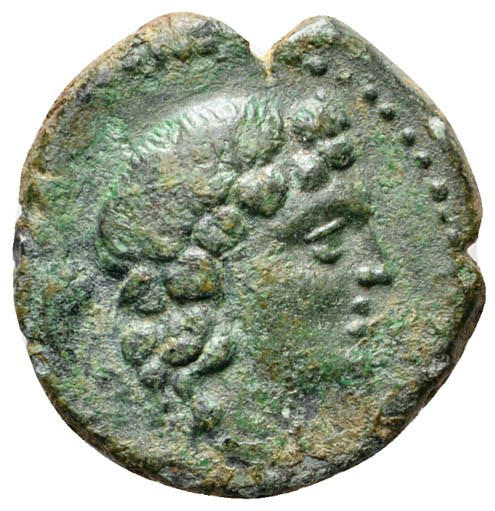 Head of young Dionysos, wreathed with ivy, right ; dotted border