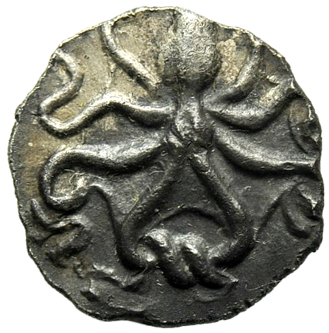 ad of Arethusa r., wearing spendone, earrings and necklace; on l., dolphin