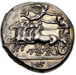 Quadriga im Galopp n.l.; der Wagenlenker hält die Zügel in d.l.Hand,Stock i. d. ausgestreckten Rechten; darüber fliegt Nike n.r. und krönt den Wagenlenker. Im Abschnitt punisch„sys“