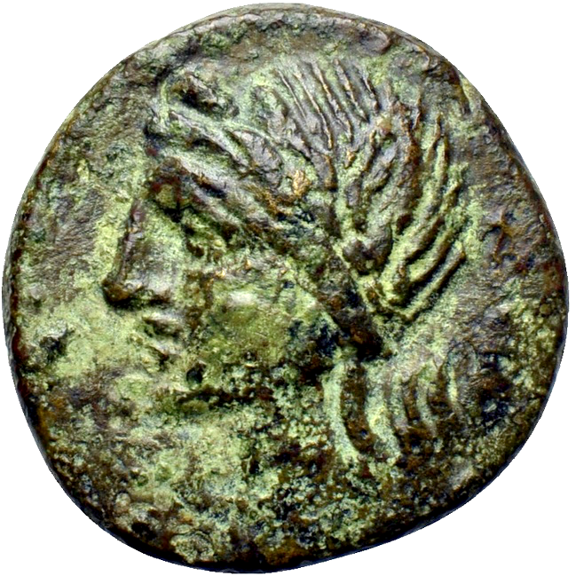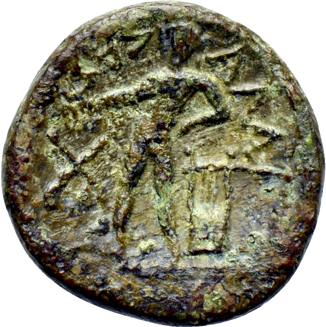 Naked Apollo standing l., holding laurel branch and leaning upon lyre. in front X, around AΛAI-ΣAΣ