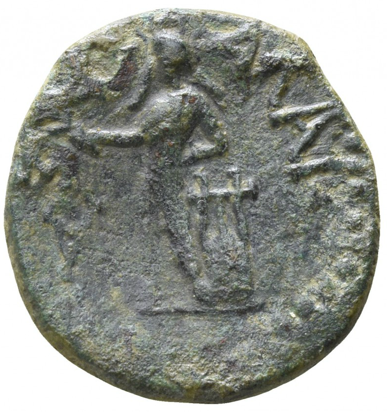 AΛAI[ΣAΣ]; nackter Apollo, mit Zweig i.d.Rechten, steht n.l.,den linken Arm auf Lyra gestützt.