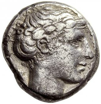 [RHΓINOΣ] Apollokopf n. r., das lange Nackenhaar in einen Lorbeerkranz hoch gesteckt; im Felde l. zweiblättriger Lorbeerspross