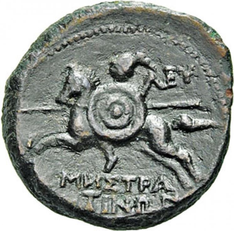 Horseman galloping l., holding shield and spear; magistrate name ΛEY above; below AMHΣTPA – TINΩN