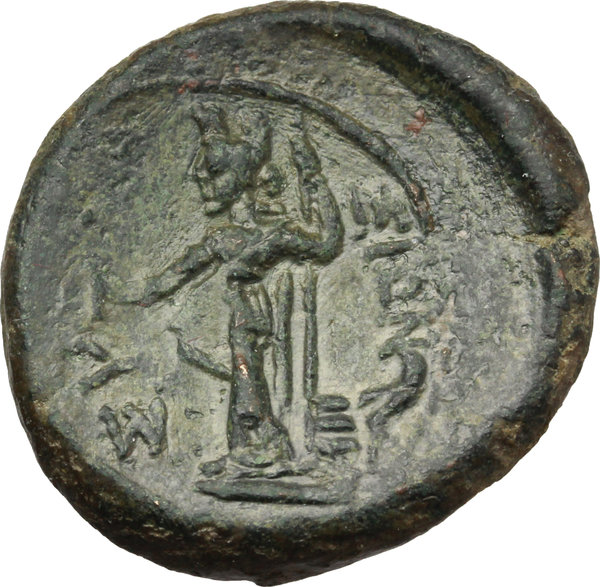 ΣYPAKO-ΣIΩN. Tyche standing left, holding rudder and sceptre; to right, prow