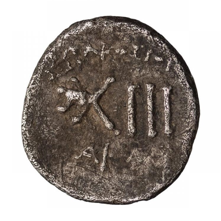 W. Giesecke interpretiert den Wert der Münze (Trichalkon) sowohl aus den 3 Punkten ,als auch aus den Buchstaben XIII; wobei das X für griechisch Chalkoi und III für die römische 3 steht. also bilingual Griechisch und Latein.