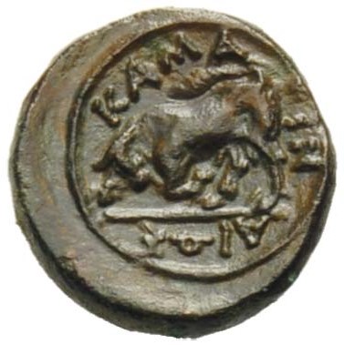 Bull butting left; exergue line and linear border, legend KAMAP-IN-AIΩN