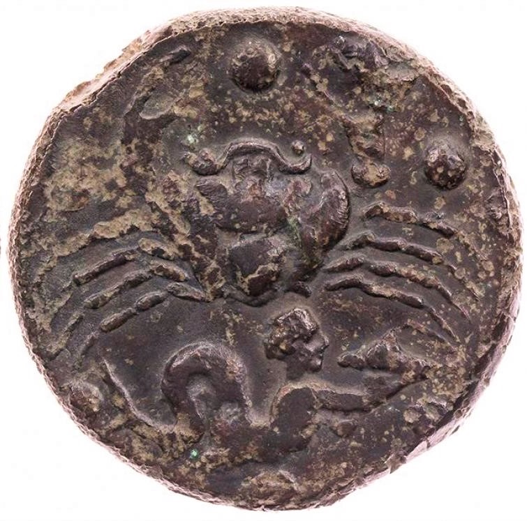 Crab; below, sea-god (Triton) to r., blowing a conch-shell; 6 pellets
