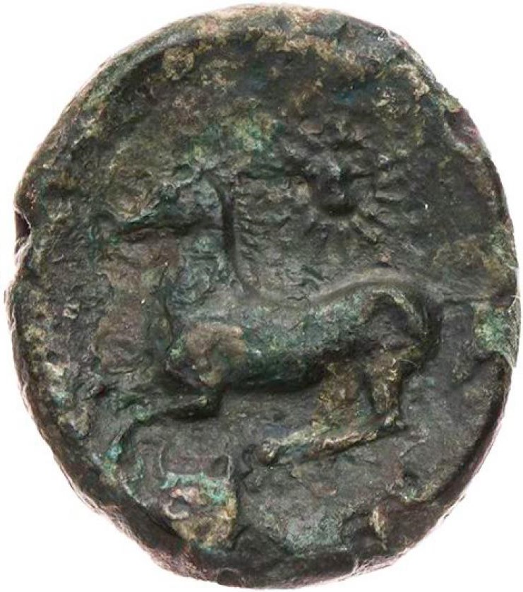 Horse galloping l.; above Helios disk, prow below horse