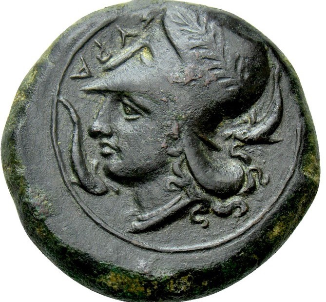 Head of Athena to left, wearing a wreathed helmet; two dolphins, one in front and one behind the head; in field left ΣYPA