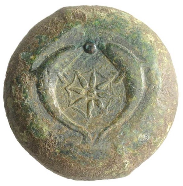 Sea-star between two dolphins; with a pellet between the heads of the dolphins