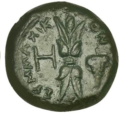 ΣΥΜΜΑΧΙΚΟΝ, winged thunderbolt; on l., H; on r., bunch of grapes
