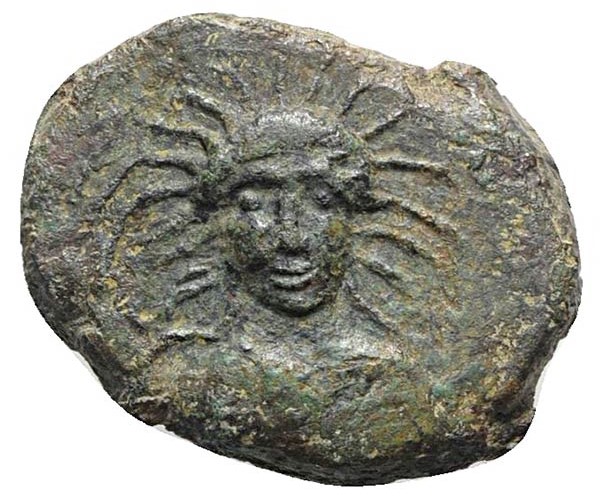Bust of Demeter facing, head ornamented with radiate leaves; left in field plough