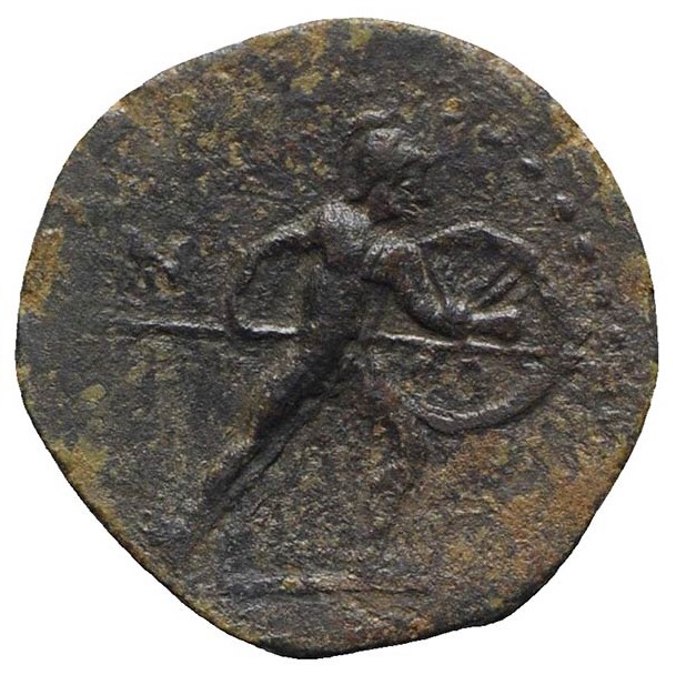 Naked Warrior advancing r., holding spear and shield.